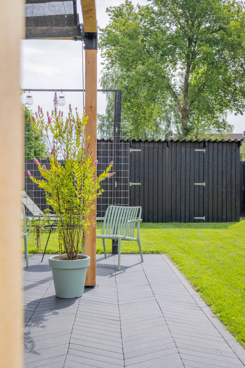 Ik heb altijd iets met Scandinavisch design gehad: rust, eenvoud, maar wel met kleur. Die stijl wilde ik ook buiten terugzien. Niet als stijltje, maar als gevoel. Daarom kozen we voor materialen die lang meegaan, lijnen die kloppen en kleuren die in balans zijn.