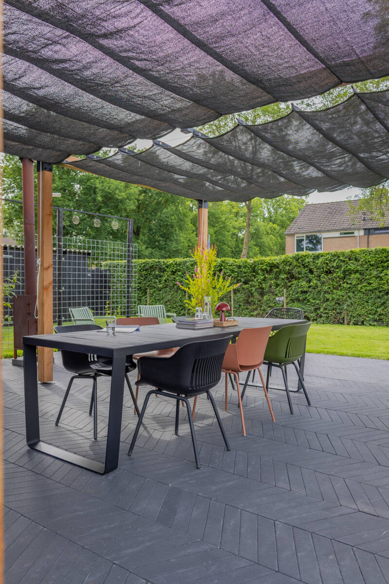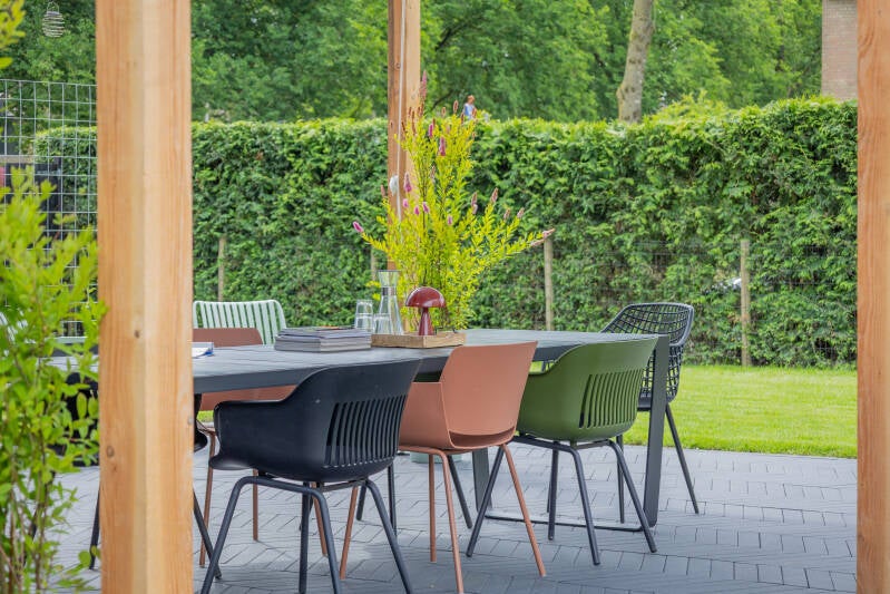 Wat voor ons belangrijk was? Dat de tuin écht bij ons leven past. We zijn geen mensen die uren in een loungeset hangen, maar we houden wel van lang tafelen, buiten eten en borrelen met vrienden. Daarom kozen we bewust voor één grote eettafel in plaats van een loungeset – met vier losse loungestoelen als flexibele aanvulling.