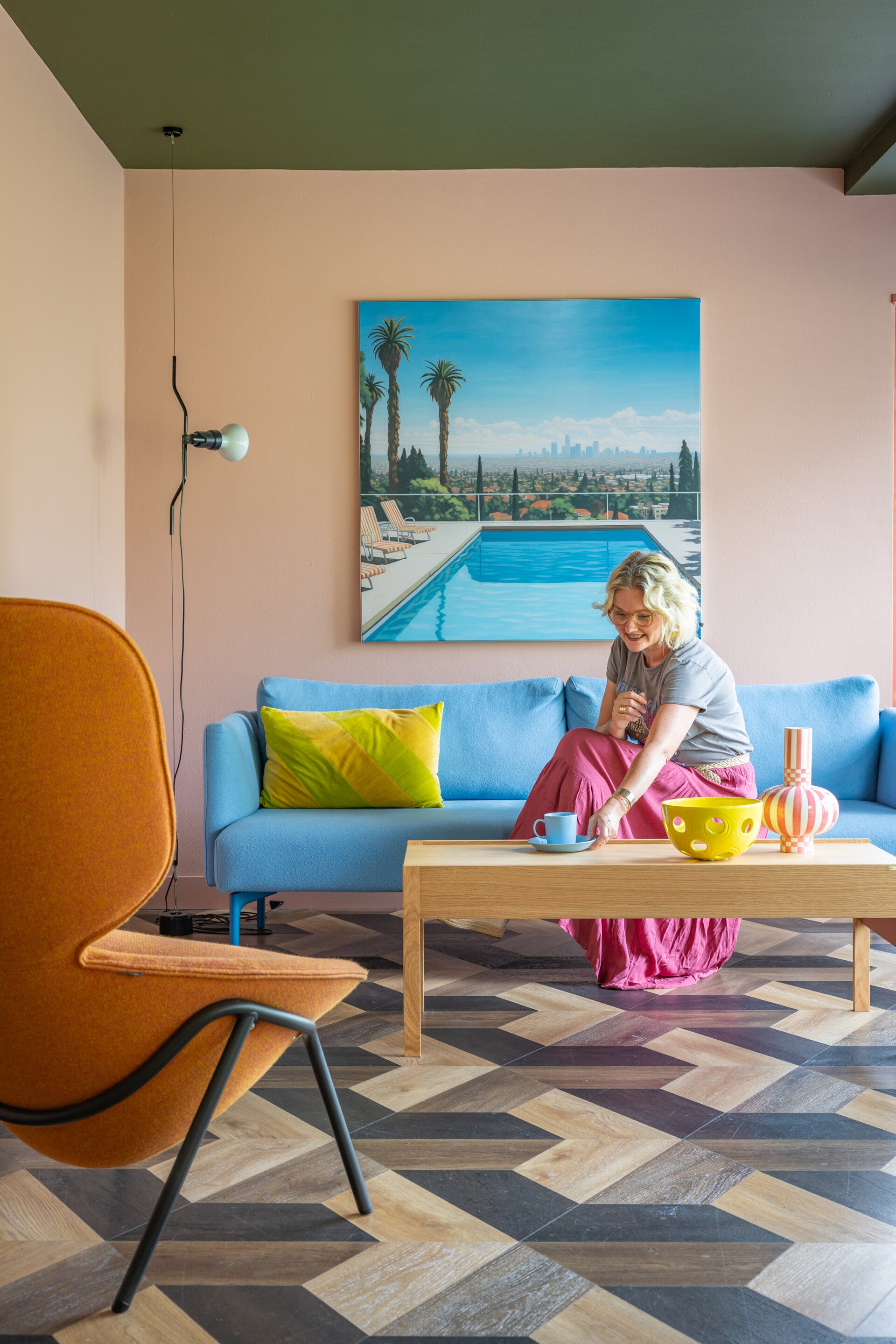 Mijn interieur is allesbehalve saai. Ik houd van kleur, dat mag duidelijk zijn…. Kleur betekent voor mij warmte en eigenheid en daarbinnen blijf ik variëren. Mijn motto: “kleur komt tot leven als je het combineert met kleur”. Het ene kunstwerk laat kleuren uit de ruimte terugkomen, het andere juist niet. Dat ton-sur-ton effect met het doek Zwembad met uitzicht werkt bijvoorbeeld prachtig met de bank. En bij Zomerse Velden zie je juist dat de kleuren uit het werk terugkomen in de rest van mijn interieur. Daardoor voelt het kloppend, zonder dat het voorspelbaar wordt.